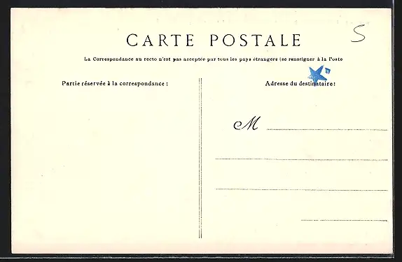 Personenbezogene Daten auf der Rückseite der Karte wurden durch blauen Textmarker unkenntlich gemacht. Die blauen Stellen sind auf die Vorderseite durchgeweicht und wirken sich negativ auf das Postkartenfoto aus