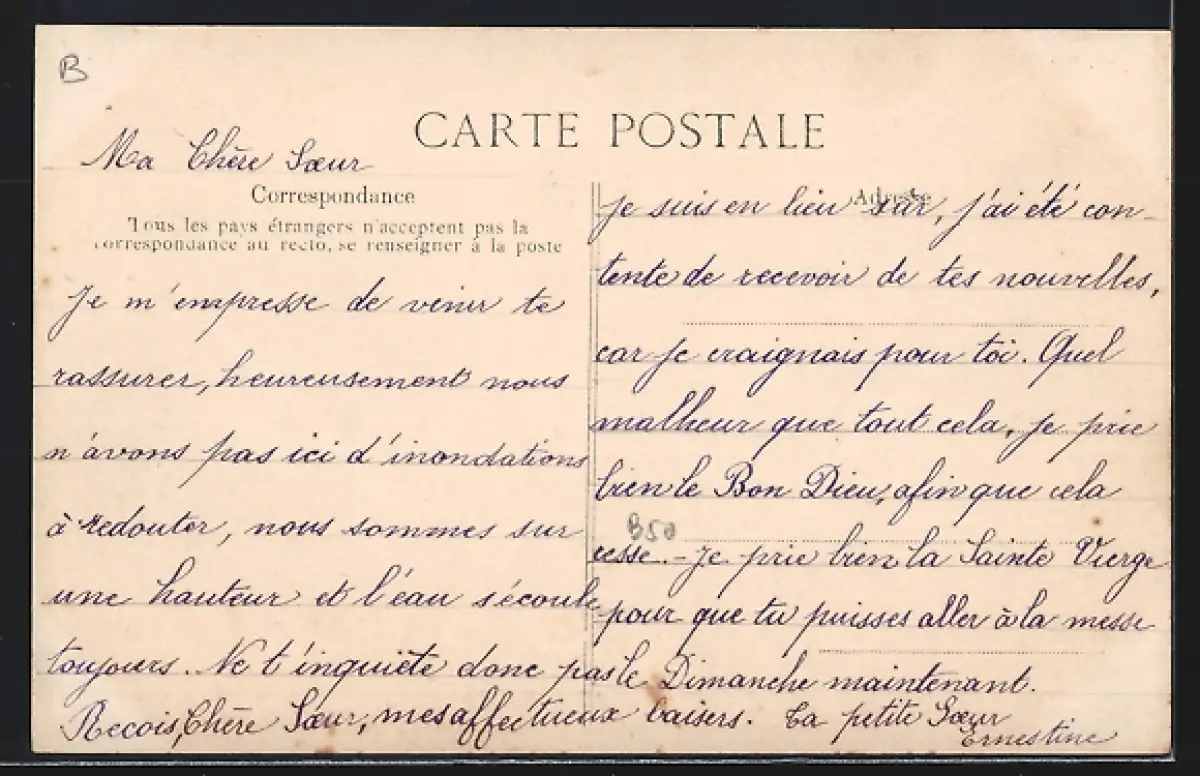 Personenbezogene Daten auf der Rückseite der Karte wurden durch blauen Textmarker unkenntlich gemacht. Die blauen Stellen sind auf die Vorderseite durchgeweicht und wirken sich negativ auf das Postkartenfoto aus