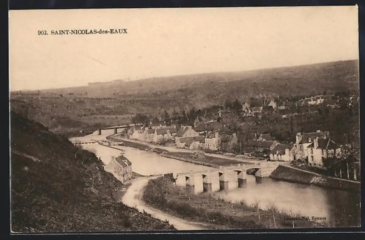 AK Saint-Nicolas-des-Eaux, Vue du village et de la rivière avec pont en arrière-plan