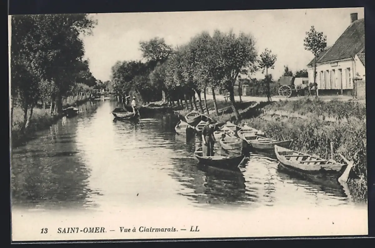 AK Saint-Omer, Vue à Clairmarais avec barques sur le canal et maison rurale