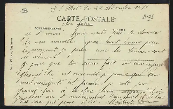 Personenbezogene Daten auf der Rückseite der Karte wurden durch blauen Textmarker unkenntlich gemacht. Die blauen Stellen sind auf die Vorderseite durchgeweicht und wirken sich negativ auf das Postkartenfoto aus