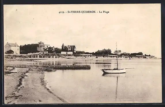 AK Saint-Pierre-Quiberon, La plage avec un bateau à voile