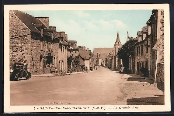 AK Saint-Pierre-de-Plesguen, La Grande Rue avec voitures et bâtiments anciens