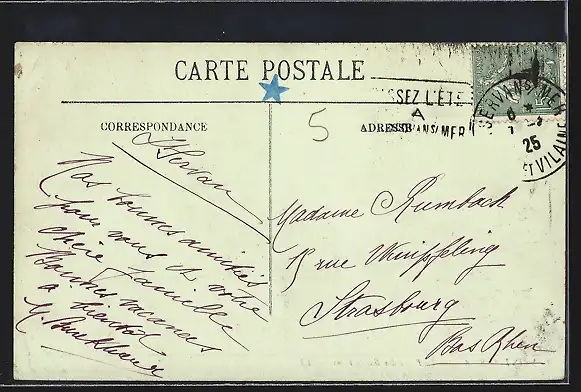 Personenbezogene Daten auf der Rückseite der Karte wurden durch blauen Textmarker unkenntlich gemacht. Die blauen Stellen sind auf die Vorderseite durchgeweicht und wirken sich negativ auf das Postkartenfoto aus