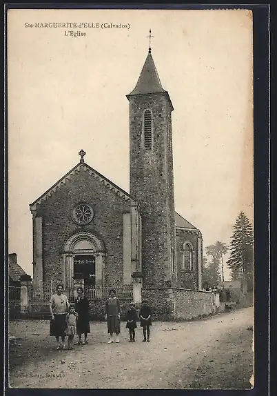 AK Sainte-Marguerite-d`Elle, L`église et habitants devant l`entrée