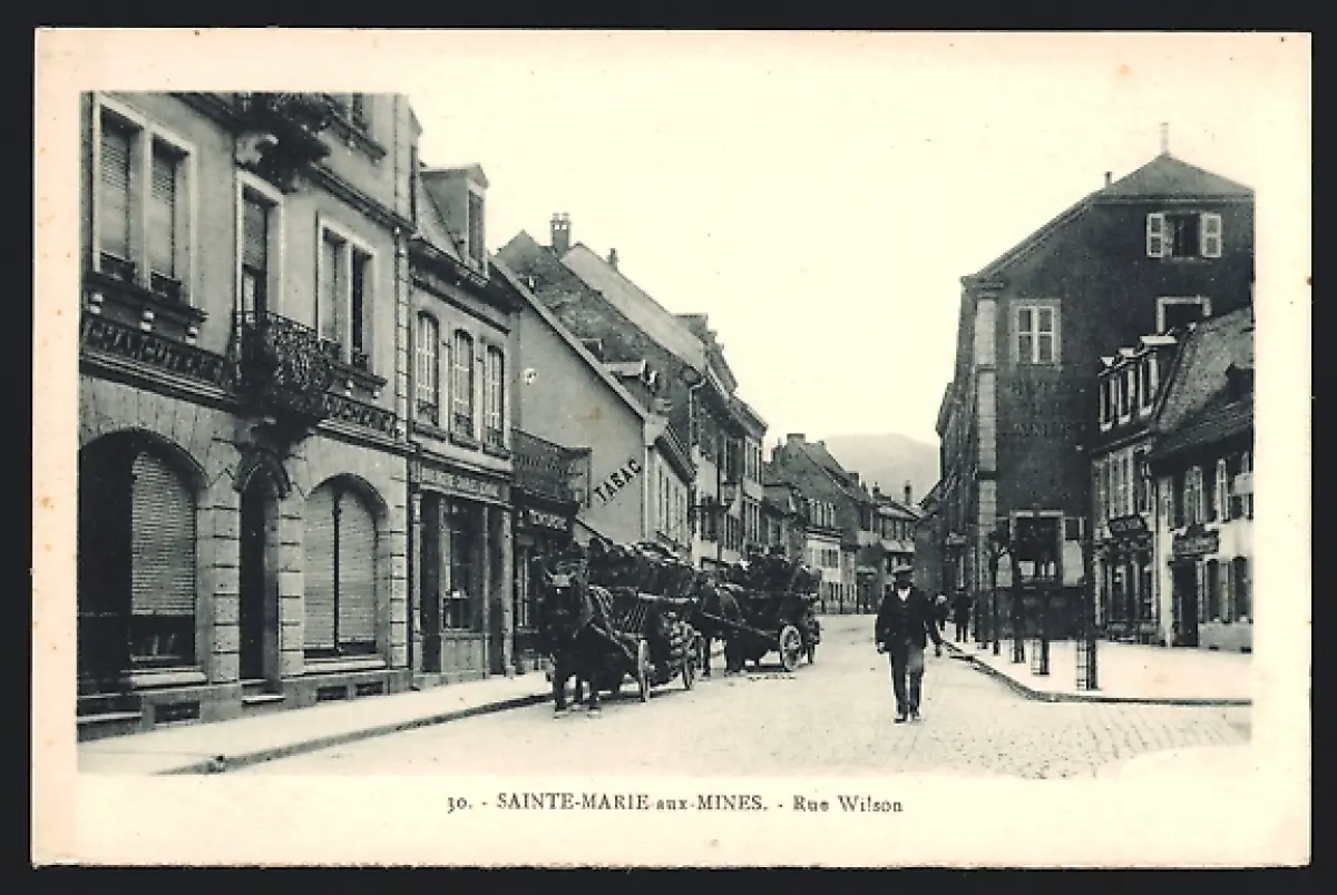 AK Sainte-Marie-aux-Mines, Rue Wilson avec calèches et passants