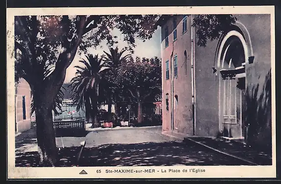 AK Sainte-Maxime, La Place de l`Église avec palmiers et architecture historique