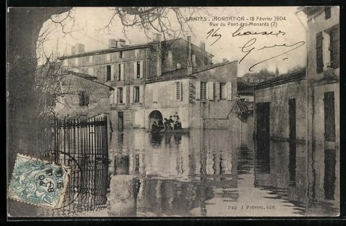 AK Saintes, Inondation 1904, Rue du Pont-des-Monards avec barque