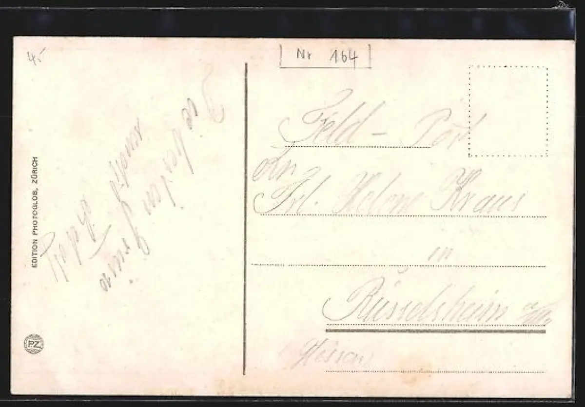 Personenbezogene Daten auf der Rückseite der Karte wurden durch blauen Textmarker unkenntlich gemacht. Die blauen Stellen sind auf die Vorderseite durchgeweicht und wirken sich negativ auf das Postkartenfoto aus