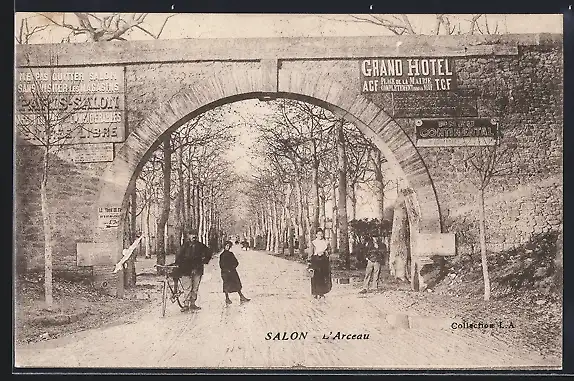 AK Salon-de-Provence, L`Arceau avec passants et cycliste sous l`allée d`arbres
