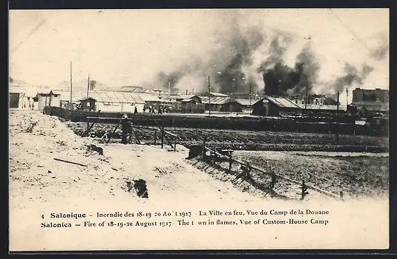 AK Salonica, Fire of 18-20 August 1917, The town in flames, Vue of Costum-House Camp