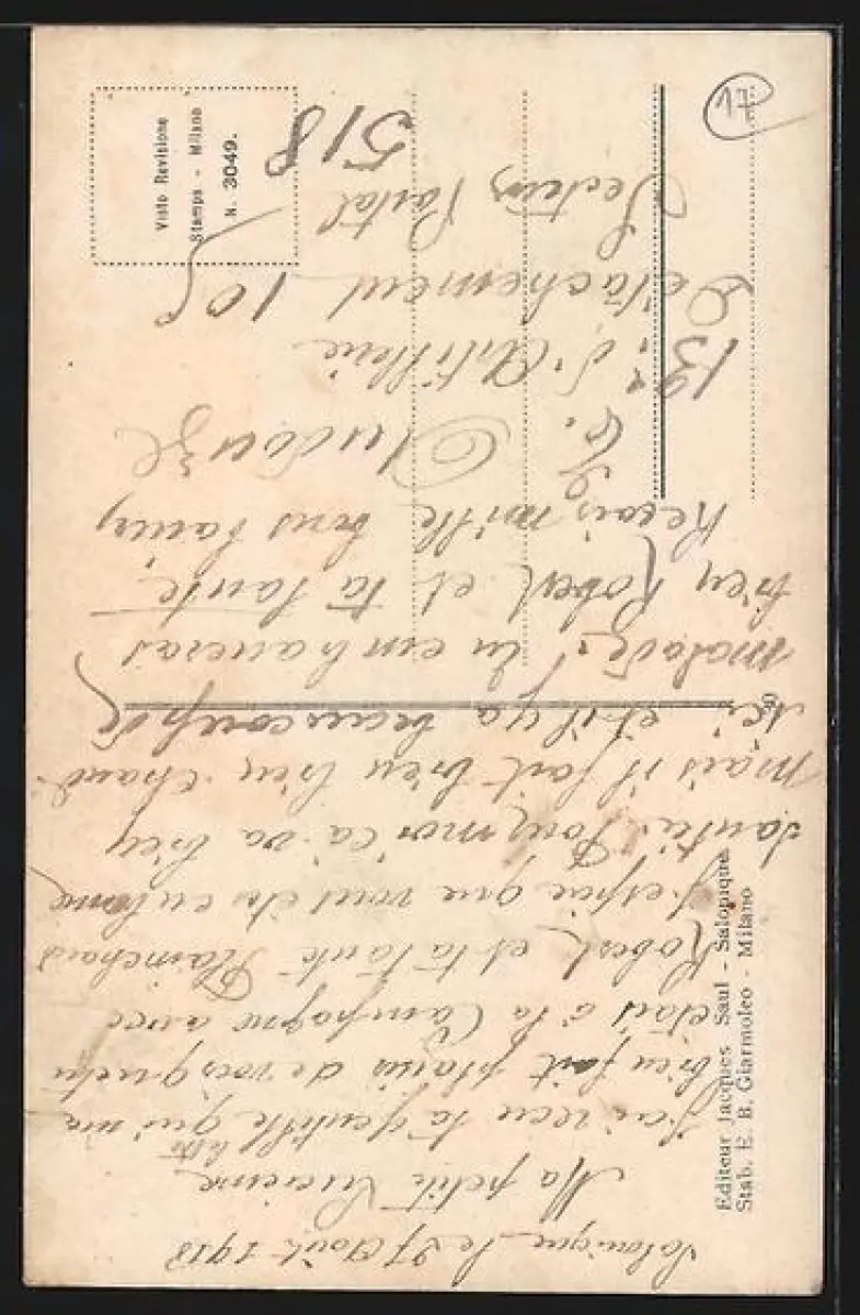 Personenbezogene Daten auf der Rückseite der Karte wurden durch blauen Textmarker unkenntlich gemacht. Die blauen Stellen sind auf die Vorderseite durchgeweicht und wirken sich negativ auf das Postkartenfoto aus