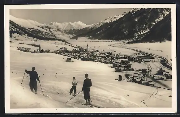 AK Samaden, Ortsansicht mit Kirche im Winter, Skiläufer am Berghang