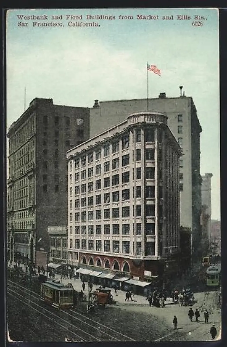 AK San Francisco, California, Westbank and Flood Buildings from Market and Ellis Streets, Strassenbahn