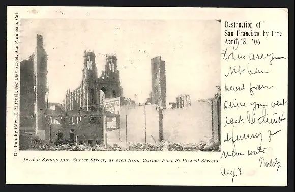 AK San Francisco, Destruction by Fire 1906, Jewish Synagogue, Sutter Street, as seen from Corner Post & Powell Streets