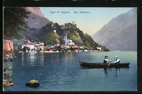 AK San Mamette, Ruderpartie mit Ortsblick auf dem Lago di Lugano