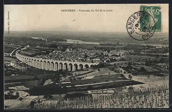 AK Sancerre, Panorama du Val de la Loire avec viaduc et vignobles en arrière-plan