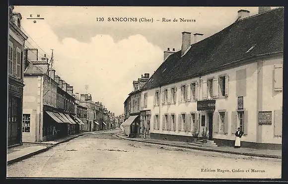 AK Sancoins, Rue de Nevers avec bâtiments et commerces