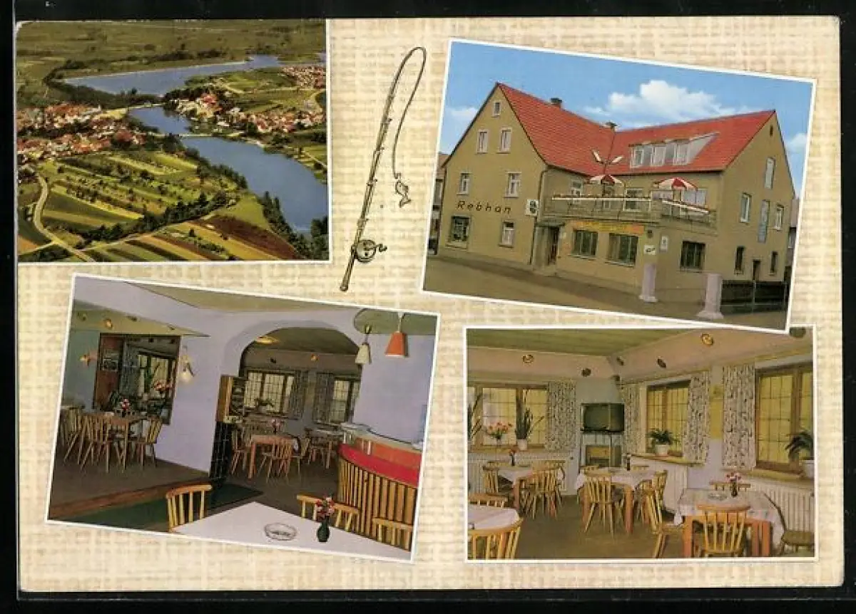 AK Sand / Main, Gasthof-Metzgerei Rebhan, Aussen- und Innenansichten, Ortspanorama