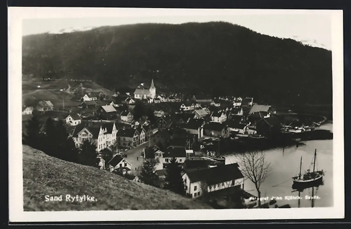 AK Sand /Ryfylke, Ortsansicht mit Kirche vom Berghang aus