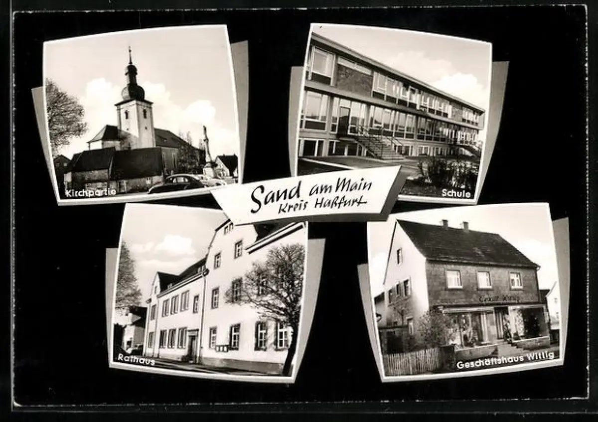 AK Sand am Main, Geschäftshaus Wittig, Schule, Kirchpartie