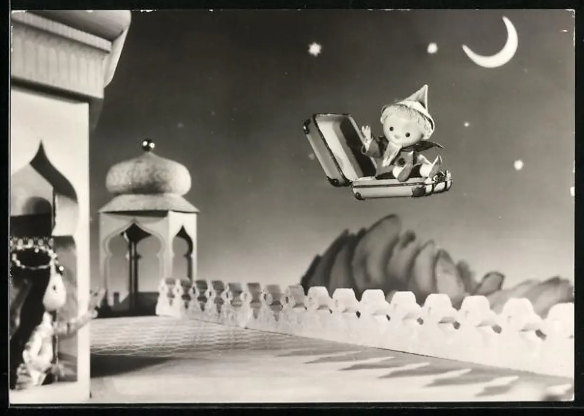 AK Sandmännchen fliegt in einem Koffer davon
