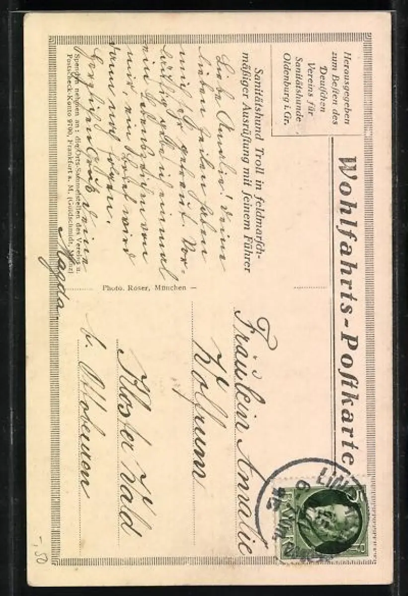 Personenbezogene Daten auf der Rückseite der Karte wurden durch blauen Textmarker unkenntlich gemacht. Die blauen Stellen sind auf die Vorderseite durchgeweicht und wirken sich negativ auf das Postkartenfoto aus