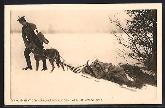 AK Sanitätshund zieht Verwundeten auf den Skiern seines Führers