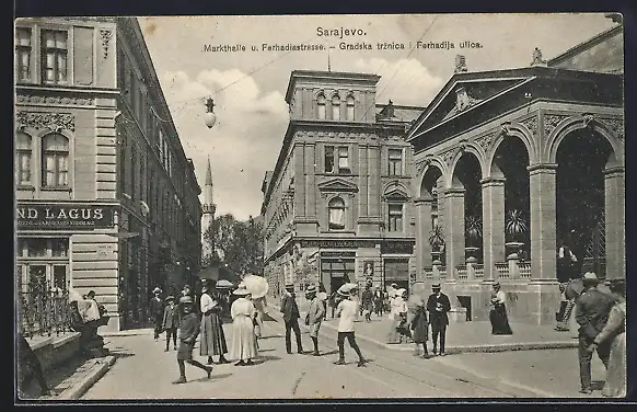 AK Sarajevo, Markthalle und Ferhadiastrasse, Geschäft von Hermann Fuchs