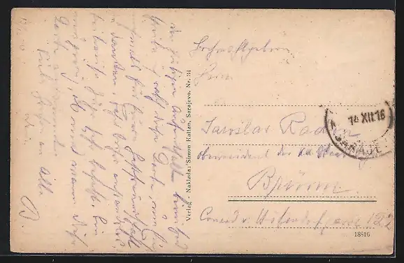 alte Ansichtskarte, gelaufen 1916, Briefmarke entfernt, rückseitig Oberflächenschaden, Stempelspur, guter Zustand