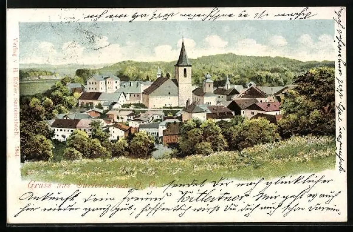 AK Sarleinsbach, Blick zum Ort mit Kirche, um 1900