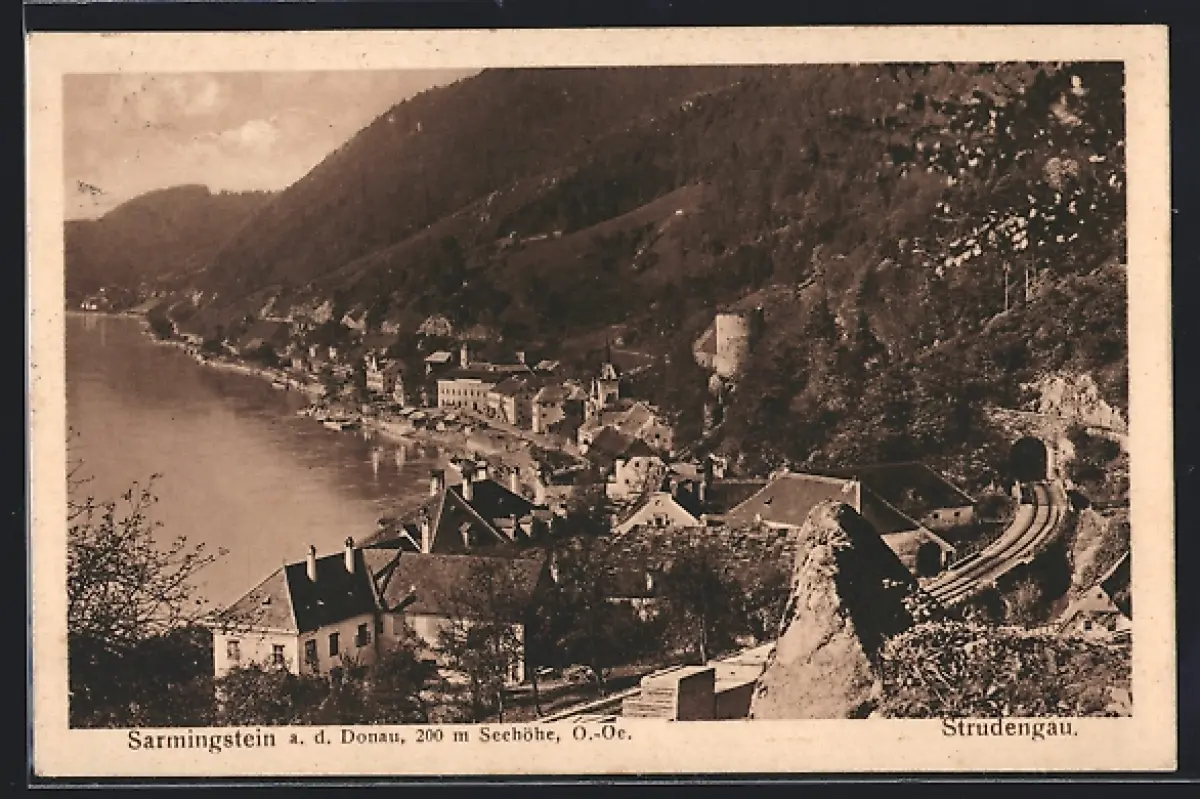 AK Sarmingstein a. d. Donau, Ortsansicht aus der Vogelschau