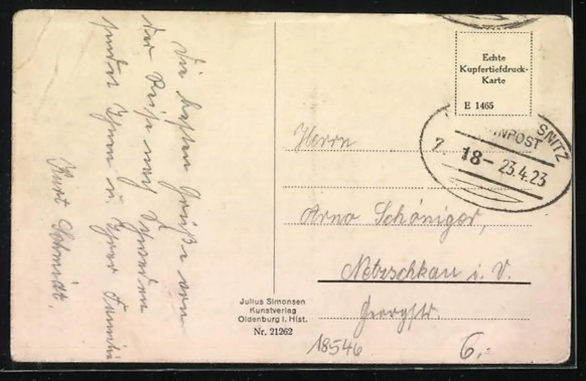 alte Ansichtskarte, gelaufen, Eckknick oben rechts, Briefmarke entfernt, guter Zustand