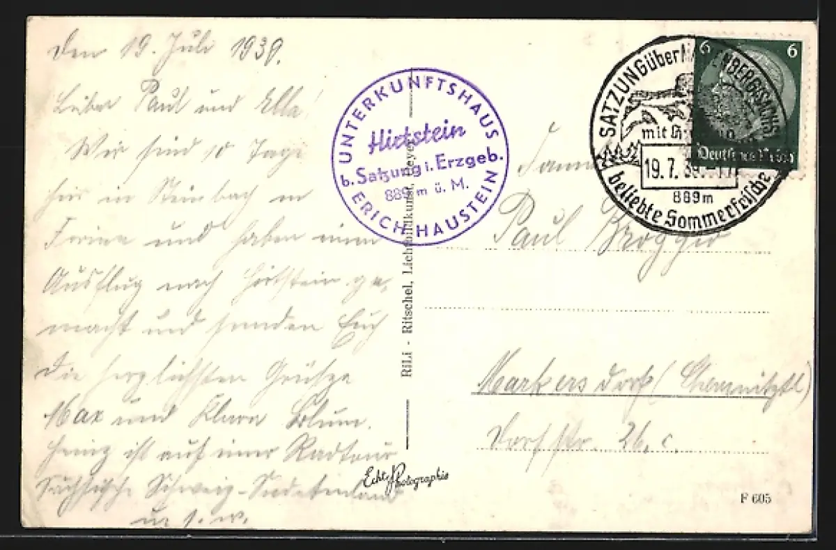Personenbezogene Daten auf der Rückseite der Karte wurden durch blauen Textmarker unkenntlich gemacht. Die blauen Stellen sind auf die Vorderseite durchgeweicht und wirken sich negativ auf das Postkartenfoto aus