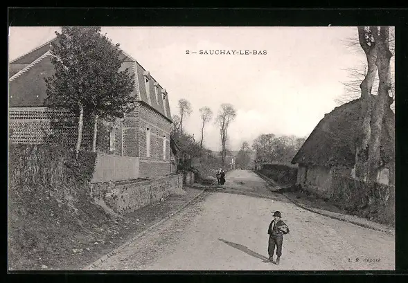 AK Sauchay-le-Bas, Strasse mit reetgedecktem Haus, Knabe