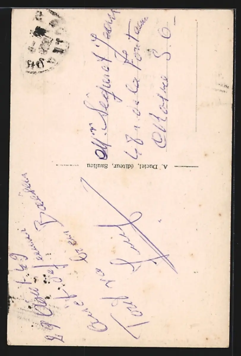 Personenbezogene Daten auf der Rückseite der Karte wurden durch blauen Textmarker unkenntlich gemacht. Die blauen Stellen sind auf die Vorderseite durchgeweicht und wirken sich negativ auf das Postkartenfoto aus