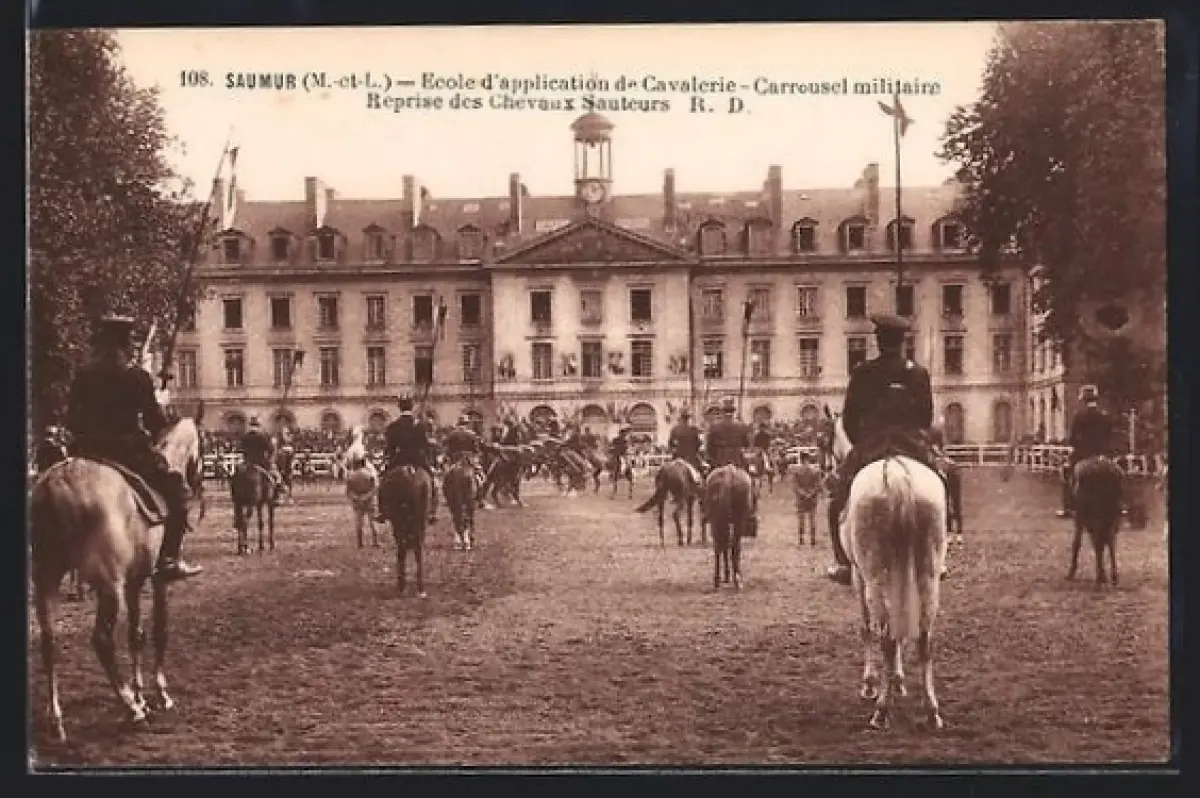 AK Saumur /M.-et-L., École d`application de Cavalerie, Carrousel militaire, Reprise des chevaux sauteurs