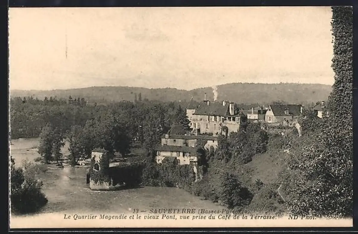 AK Sauveterre /Basses-Pyrénées, Le Quartier Magendie et le vieux Pont, vue prise du Café de la Terrasse