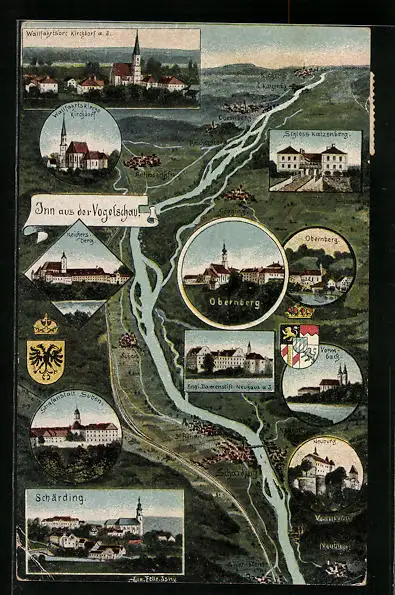 AK Schärding, Ortsansicht, Inn aus der Vogelschau von Wernstein bis Obernberg
