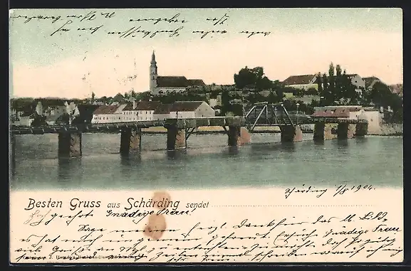 AK Schärding, Ortsansicht mit Brücke und Kirche