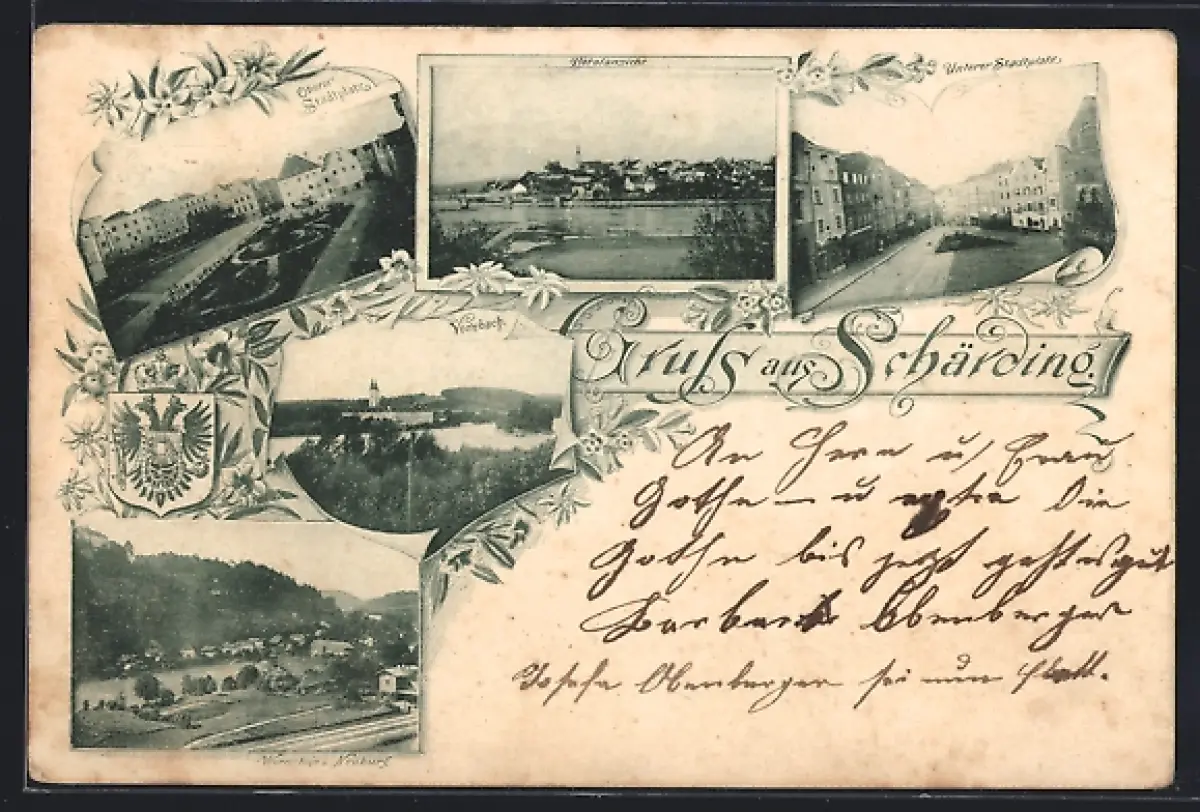 AK Schärding, Vornbach, Unterer Stadtplatz, Wernstein u. Neuburg, Wappen