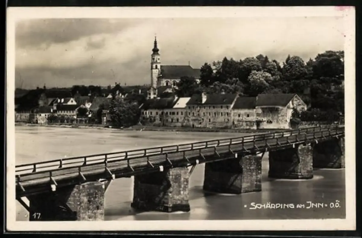 AK Schärding am Inn, Brücke über den Inn, Ortsansicht mit Kirche