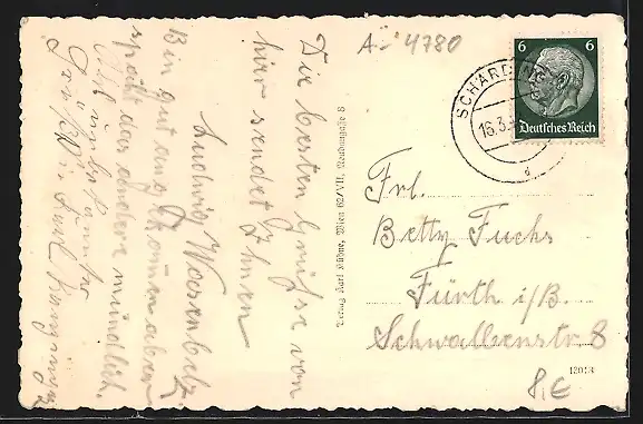 Personenbezogene Daten auf der Rückseite der Karte wurden durch blauen Textmarker unkenntlich gemacht. Die blauen Stellen sind auf die Vorderseite durchgeweicht und wirken sich negativ auf das Postkartenfoto aus