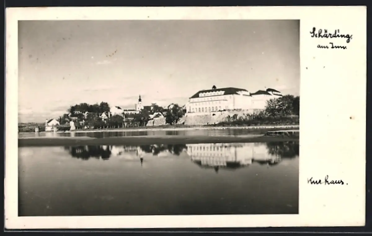 AK Schärding am Inn, Teilansicht mit Kurhaus und Uferpartie