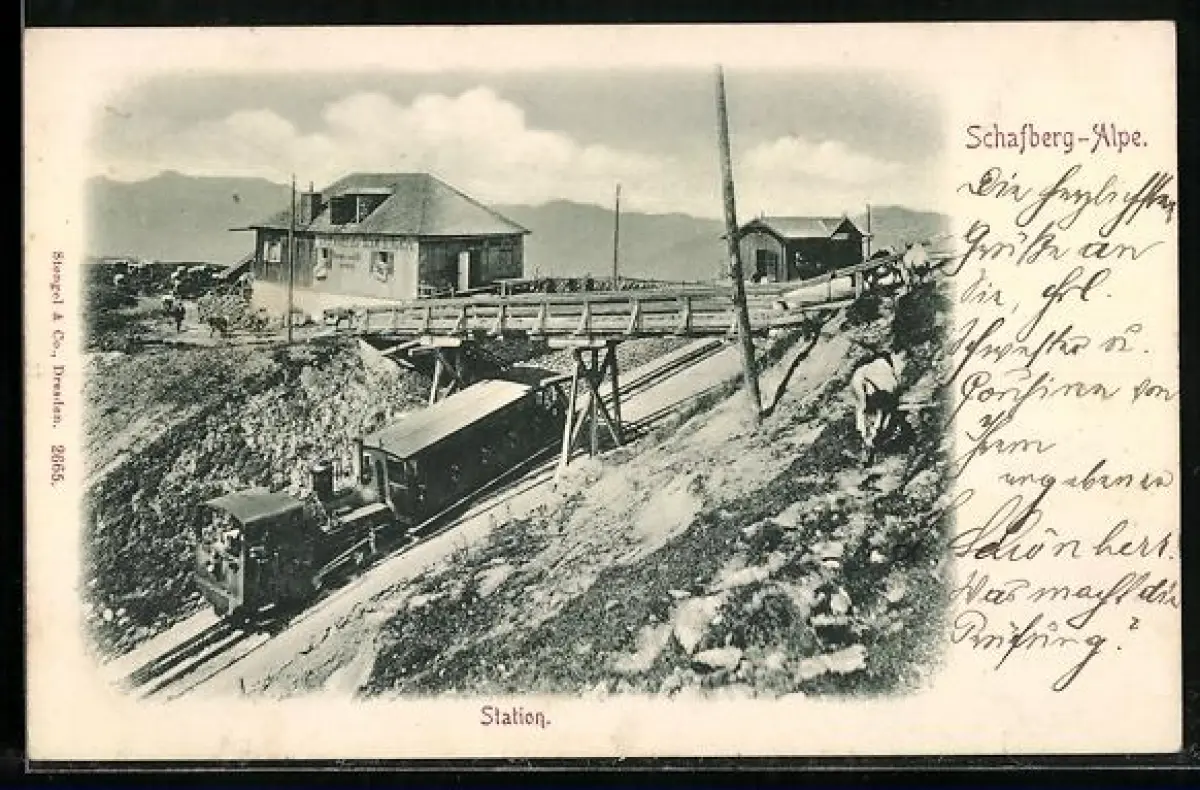 AK Schafberg, Schafbergbahn, Gasthaus zur Schafbergalpe mit Station der Bergbahn