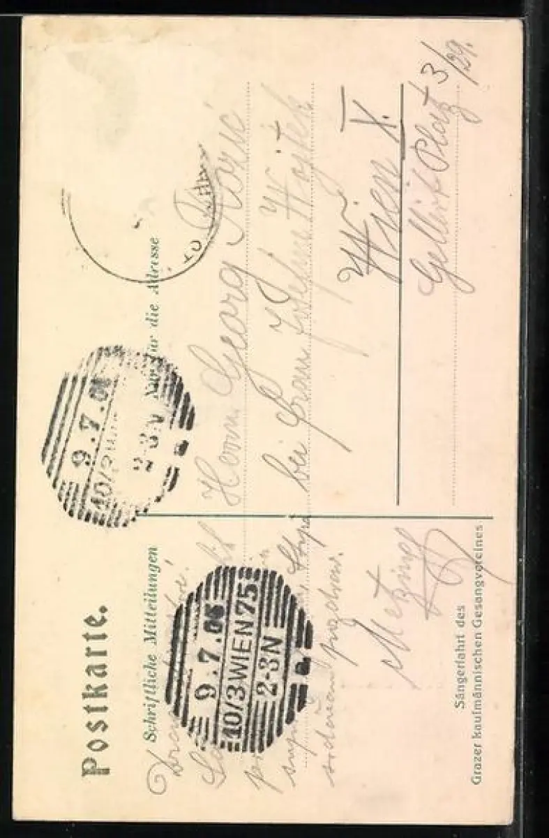Personenbezogene Daten auf der Rückseite der Karte wurden durch blauen Textmarker unkenntlich gemacht. Die blauen Stellen sind auf die Vorderseite durchgeweicht und wirken sich negativ auf das Postkartenfoto aus