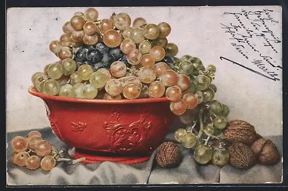 AK Schale mit Weintrauben neben Walnüssen, Obst