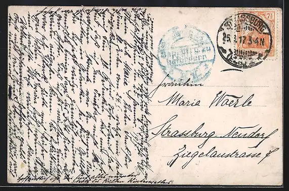 Personenbezogene Daten auf der Rückseite der Karte wurden durch blauen Textmarker unkenntlich gemacht. Die blauen Stellen sind auf die Vorderseite durchgeweicht und wirken sich negativ auf das Postkartenfoto aus