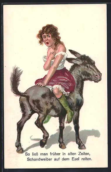 AK Schandweib, Frau sitzt rittlings auf einem Esel