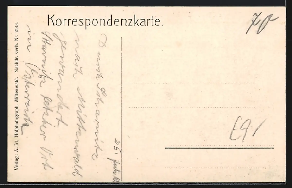 Personenbezogene Daten auf der Rückseite der Karte wurden durch blauen Textmarker unkenntlich gemacht. Die blauen Stellen sind auf die Vorderseite durchgeweicht und wirken sich negativ auf das Postkartenfoto aus